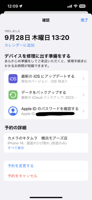 (iPhoneの[画面のひび割れ(前面のみ)]の症状で[カメラのキタムラ 横浜モアーズ店]に[9/28 13:00]で予約されています)
