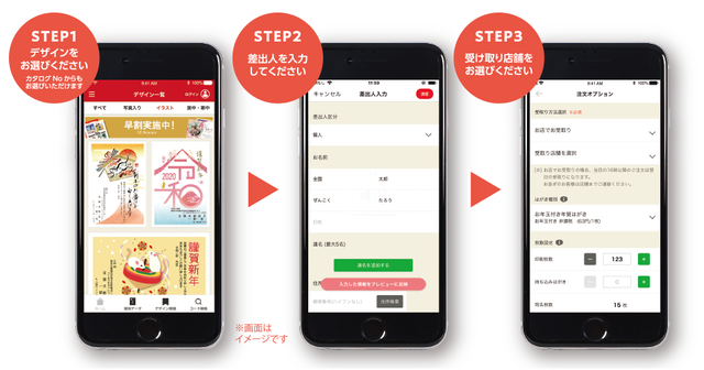 年賀状作りの3ステップが、スマホひとつで完結します!
