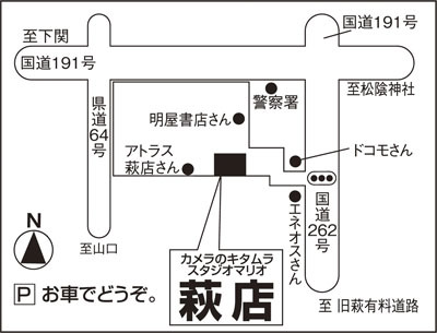 カメラのキタムラ萩店ならアトラス萩店から徒歩1分。