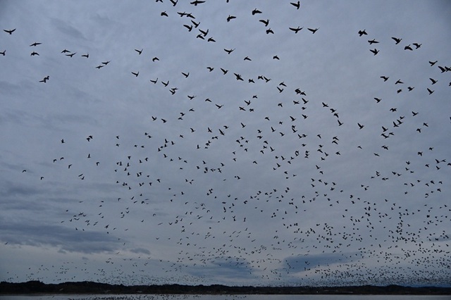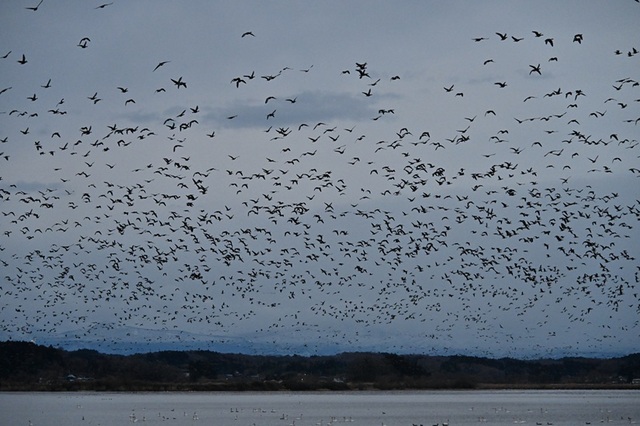 この時期は渡り鳥が辺りの湖沼を寝床にしており、朝晩のえさ場への壮大な移動が見ものです