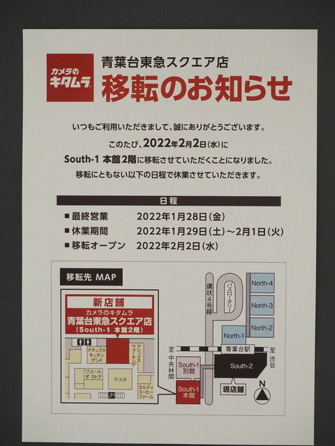- 店舗移転に伴う臨時休業のお知らせ キタムラ青葉台東急スクエア店