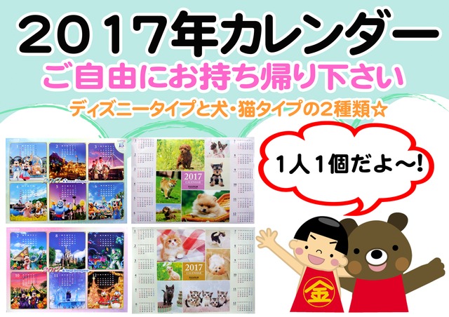 - 2017年カレンダー【ディズニー&犬猫】無料配布だお~。米原店