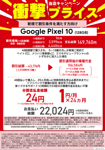 【Pixel10月額1円】最大24か月ソフトバンク純新規 MNP