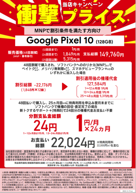 - 【Pixel10月額1円】最大24か月ソフトバンク純新規 MNP