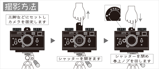 1:カメラを固定し、手でシャッターを引き上げ露光スタート!