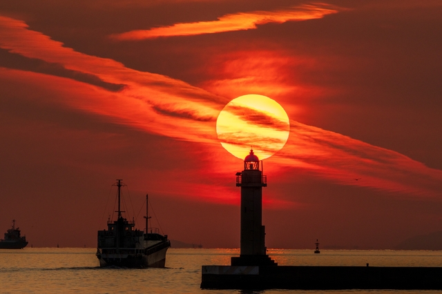 灯台や船が入った美しい夕景
