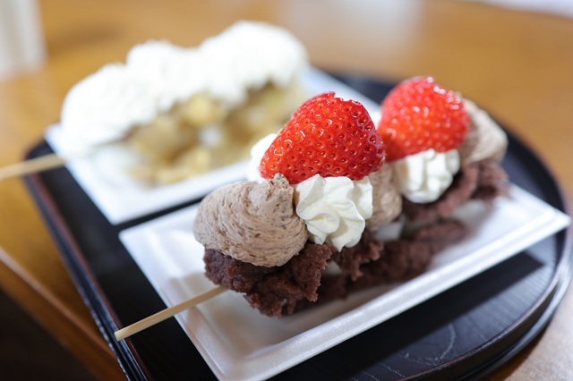 ぐっと寄っているので後ろの芋クリーム団子は大きくボケています。