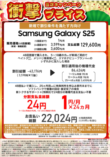 - 【月額1円】×24か月 SB 純新規MNP Galaxy S25