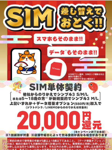 【MNP】ワイモバSIM 最大20,000円+紹介キャンペーン